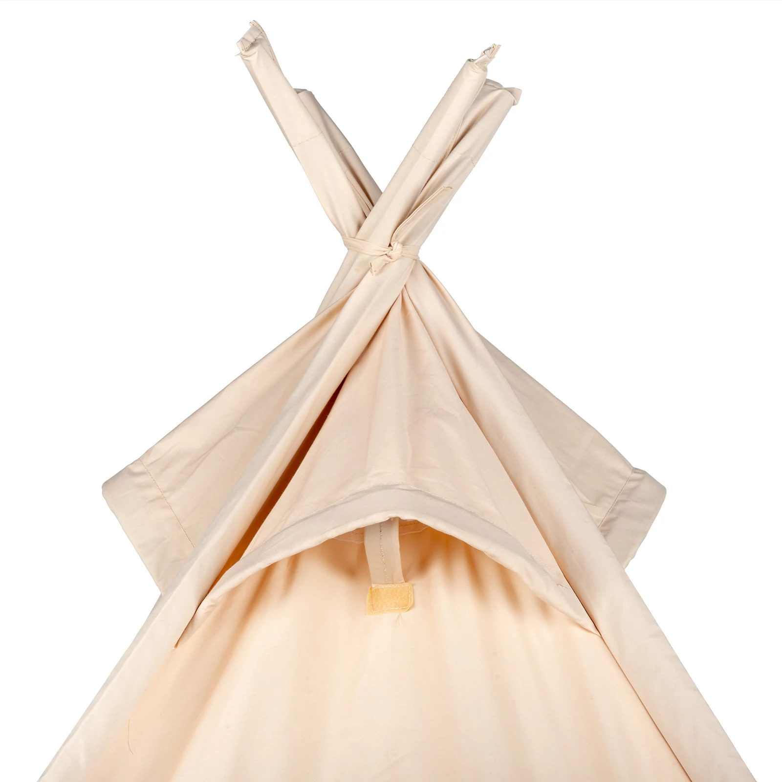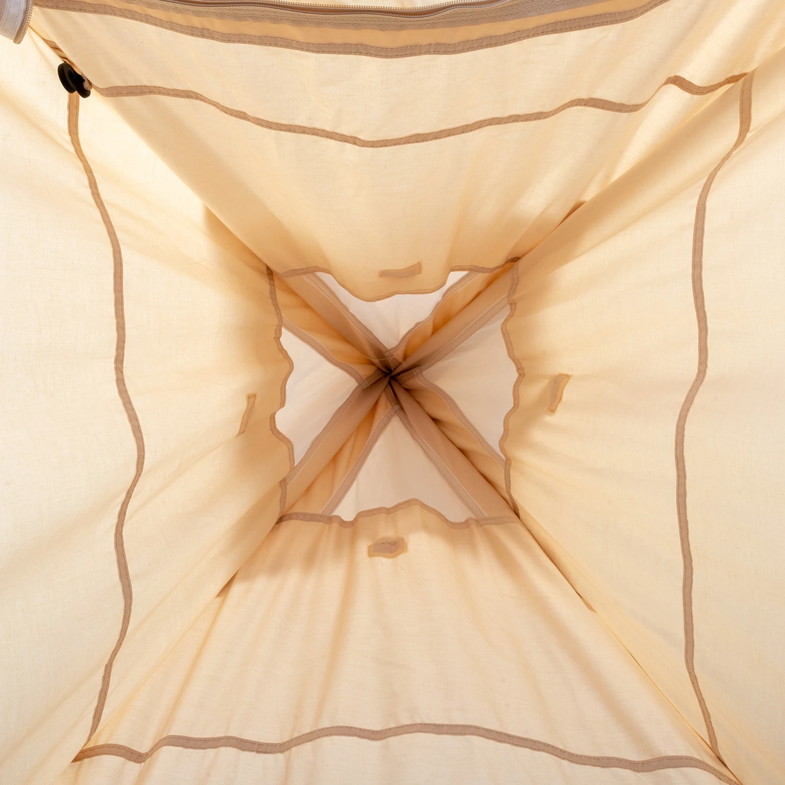 There are four ventilation holes on the top of the tent, which can circulate air and keep it ventilated. Two doors are convenient for entry and exit. This tent has a pyramid-shaped appearance, double-layer structure, cotton material, PU coating, which can be waterproof, and also provides a spacious space . Perfect for family camping or hiking with friends.