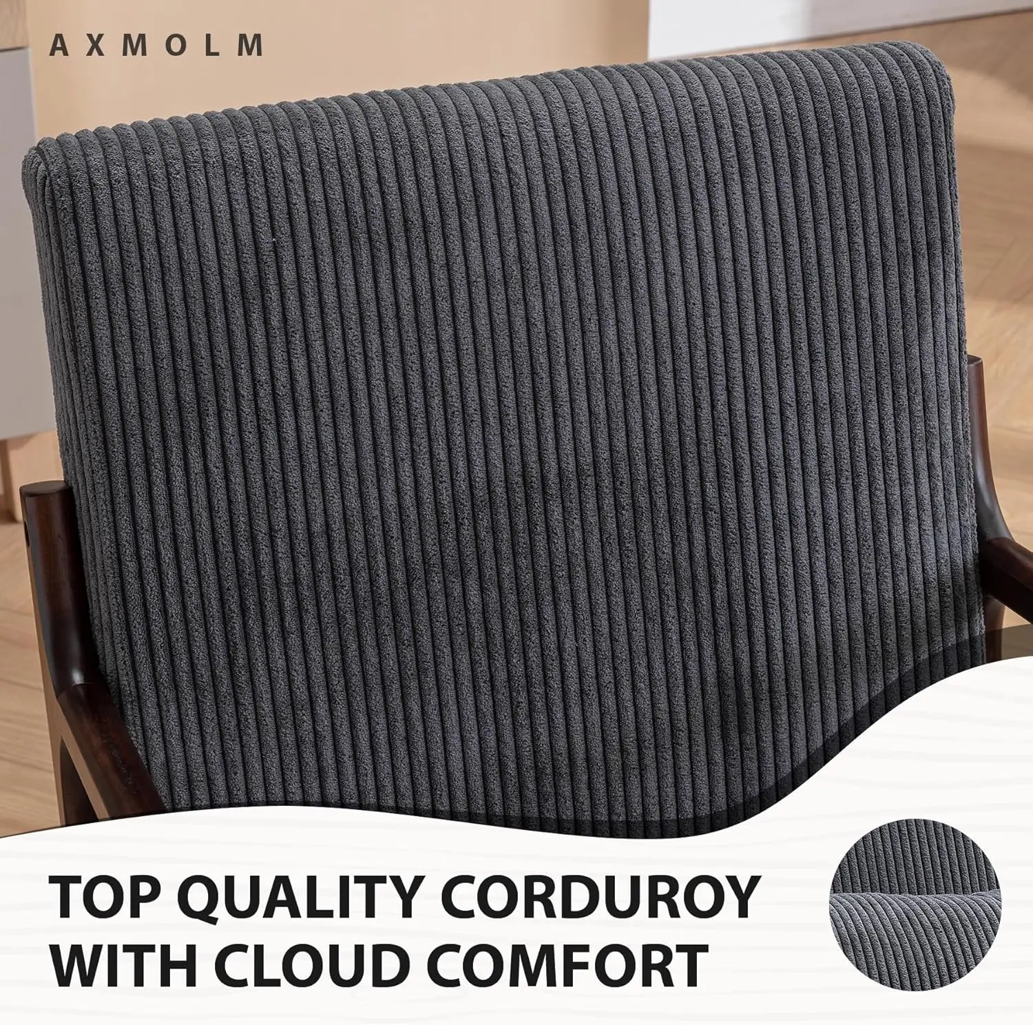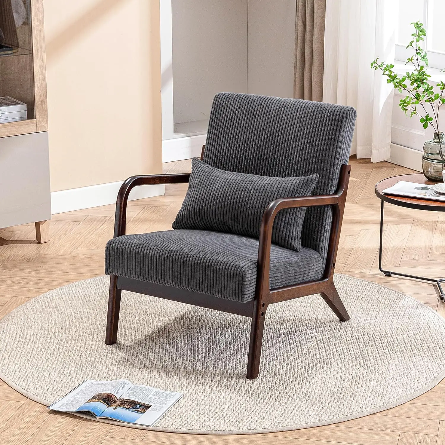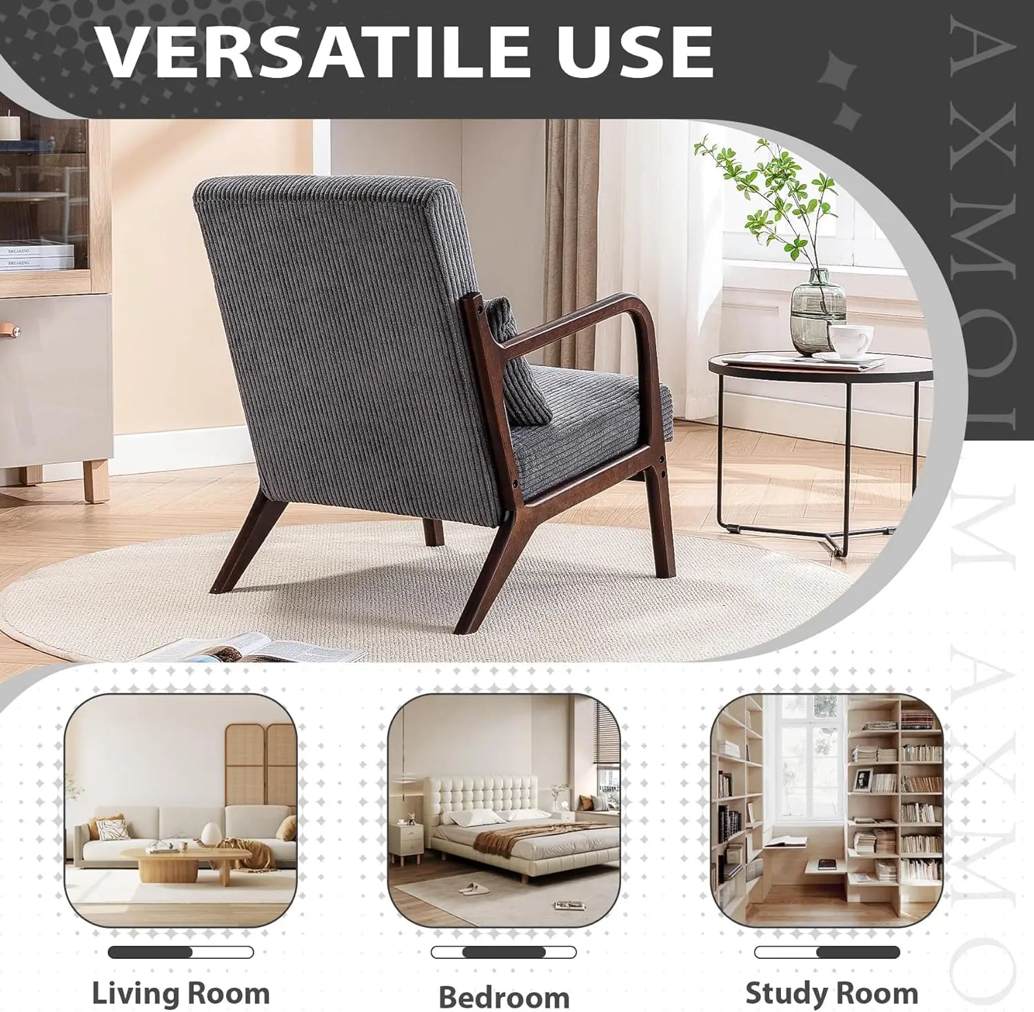 - [MID CENTURY MODERN ACCENT CHAIR]: Designed with curved armrests and flared legs, this corduroy accent chair with extra pillow features dark brown wood armrests for a calm and elegant mid-century vibe that suits any style of home decor