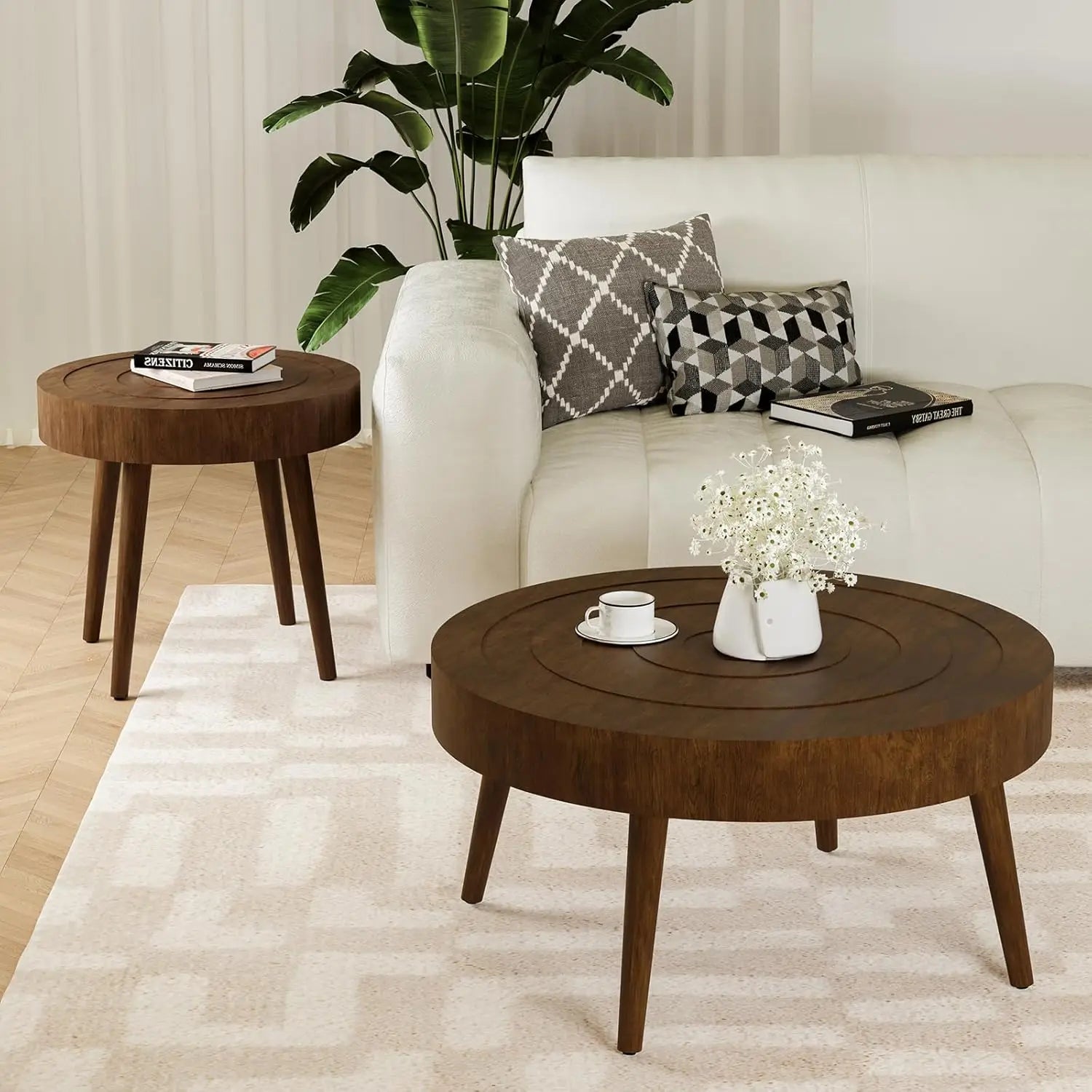 HOMPUS Nesting Coffee Tables w Wood Grain Finish, 2 Pieces Living Room Tea Table Sets w Wood Legs, Round Coffee Table sets w with Handcrafted Ring Pattern, Modern Accent Coffee Table for Living Room